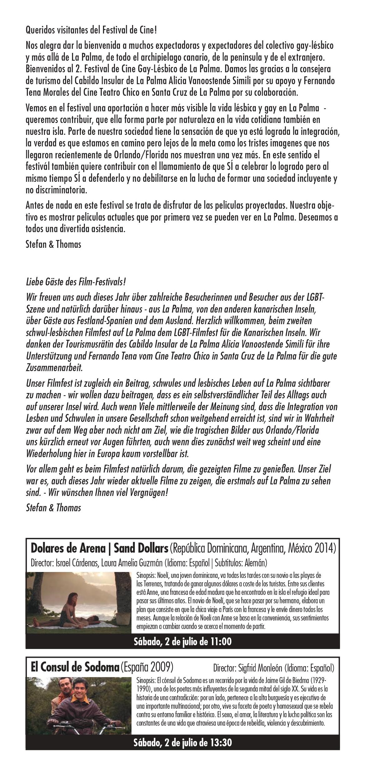 La iniciativa para el segundo Festival de Cine Gay-Lésbico tuvo el apoyo una vez más del Cine Teatro Chico y de la Consejería de Turismo de La Palma. Queremos dar las gracias expresamente a ellos.