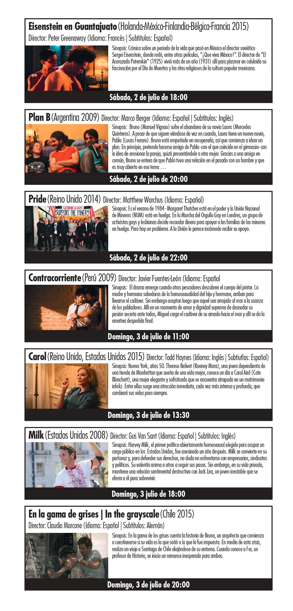 Das genaue Programm wurde noch nicht veröffentlicht, aber bereits nach dem letztjährigen Event wurden Pläne für die diesjährige Ausgabe des Filmfests geschmiedet: 2016 sollen auch Filme mit lesbischer Thematik ins Programm aufgenommen werden. Die Internationalität des Filmfests soll erhalten bleiben und gleichzeitig wird angestrebt spanischen und spanischsprachigen Filmen einen großen Stellenwert einzuräumen, um besonders das einheimische Publikum noch stärker anzusprechen.