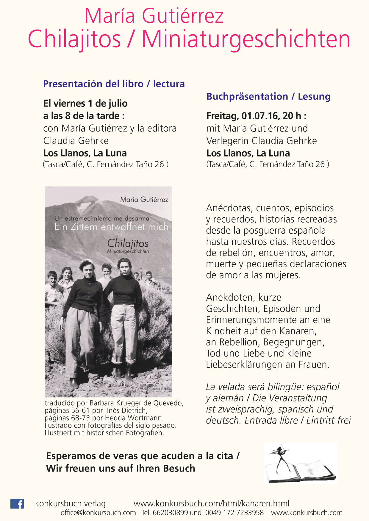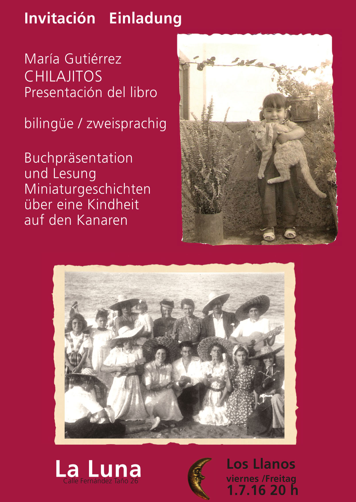 Presentación del libro „Chilajitos“con María Gutiérrez y Claudia Gehrke. La escritora canaria esta vez en una edición bilingüe español-alemán, una colección de pequeñas joyas literarias, anécdotas, cuentos, episodios y recuerdos desde la posguerra español … infancia, rebelión, encuentros, muerte, amor …