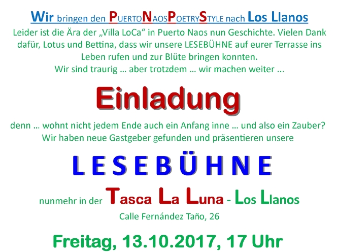 13.10.17 | 17:00 hrs | Lesebühne (Veranstaltg. auf deutsch) Posted on 6. October 2017 by brastebra Evento en lengua alemán Veranstaltung in deutscher Sprache Event in german language Event in het Duits Événement en langue allemande Info: christelsueriekindler@gmail.com Teilen mit: Click to share on X (Opens in new window) X Click to share on WhatsApp (Opens in new window) WhatsApp Click to share on Facebook (Opens in new window) Facebook Like Loading... Related