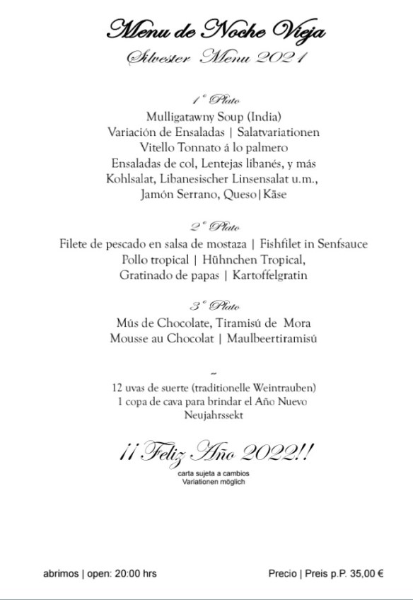 Menu Noche Vieja 2021 Silvester Image Posted on 28. December 2021 by brastebra Reservas|Reservierungen Teléfono 922401913 Teilen mit: Click to share on X (Opens in new window) X Click to share on WhatsApp (Opens in new window) WhatsApp Click to share on Facebook (Opens in new window) Facebook Like Loading... Related