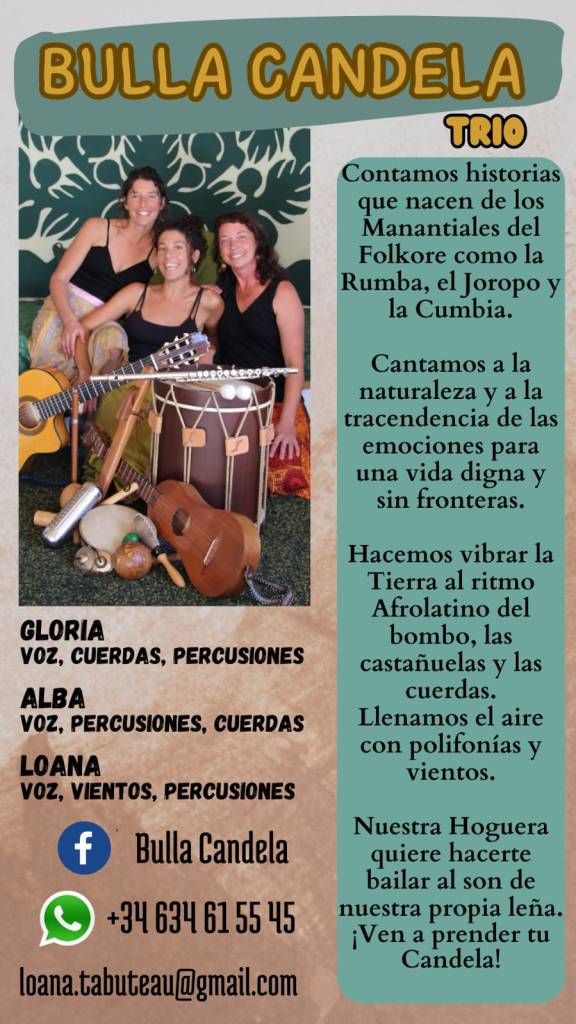 04.12.25 Live Music 20:00 hrs BULLA CANDELA TRIO Posted on 27. November 2025 by brastebra Gloria: voz, cuerdas, percusión | Gesang, Streichinstrument, PercussionAlba: voz, percusión, cuerdas | Gesang, Percussion, Streichinstrument,Loana: voz, vientos, percusión | Gesang, Percussion, Blasmusik Teilen mit: Click to share on X (Opens in new window) X Click to share on WhatsApp (Opens in new window) WhatsApp Click to share on Facebook (Opens in new window) Facebook Like Loading... Related