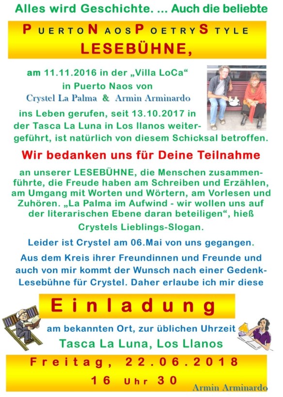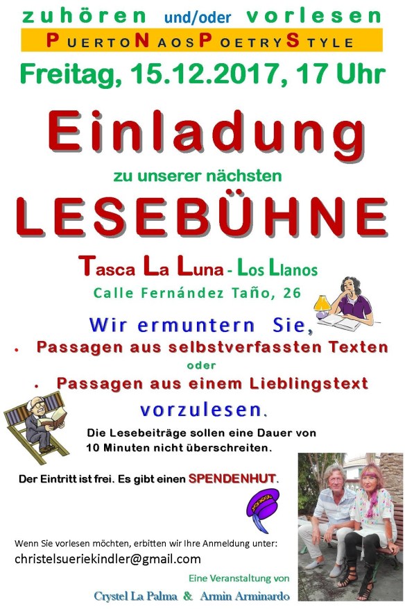 Viaje literario por la “isla bonita” de La Palma . Lecturas y música en directo y presentación de fotos históricas. Sobre volcanes, paisajes y casas antiguas y sus emocionantes historias , de las generaciones que vivieron en ellas. Con Lucía Rosa González, Eva-Maria Bauer y otros. Acompañamiento musical por Nieves Hernández Leal